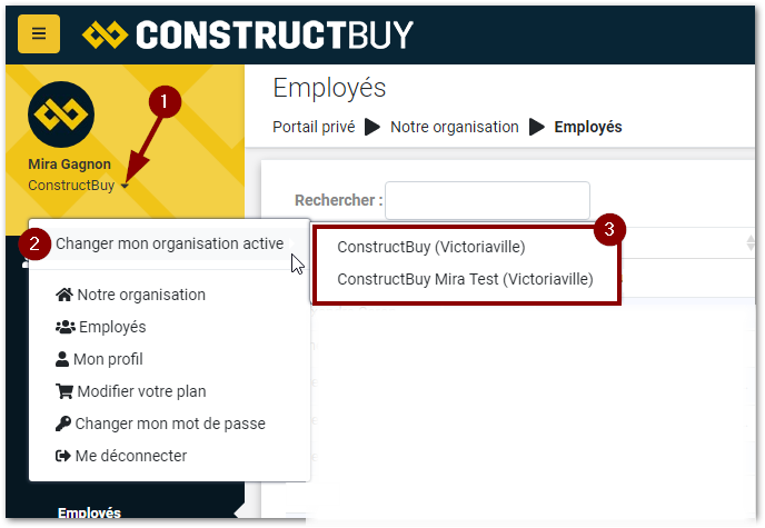 Cliquez sur Changer mon organisation active (si cette option n’est pas disponible vous avez seulement un compte ConstructBuy de lié à cette adresse courriel)