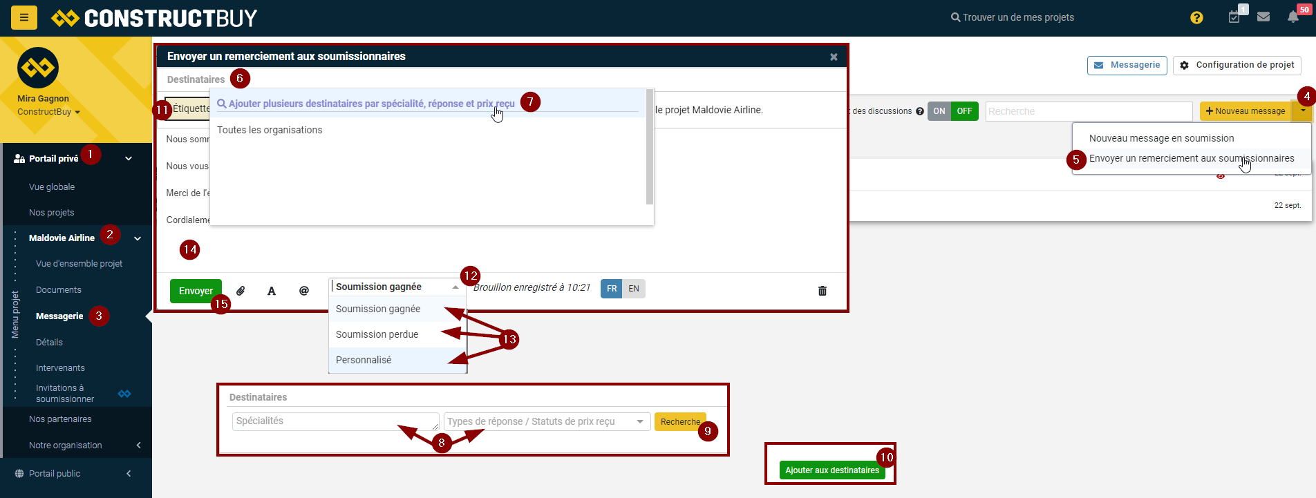 Tapez ou modifiez si nécessaire le message que vous souhaitez envoyer à vos soumissionnaires de projet sélectionnés