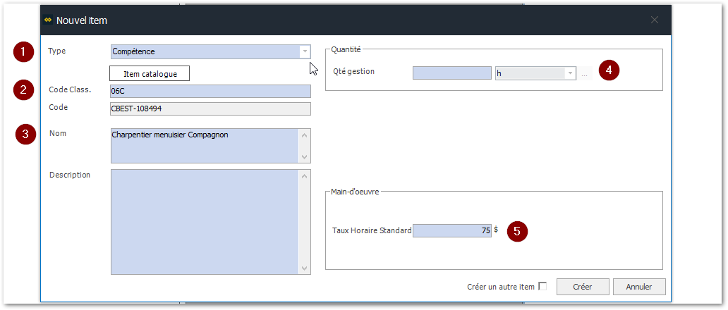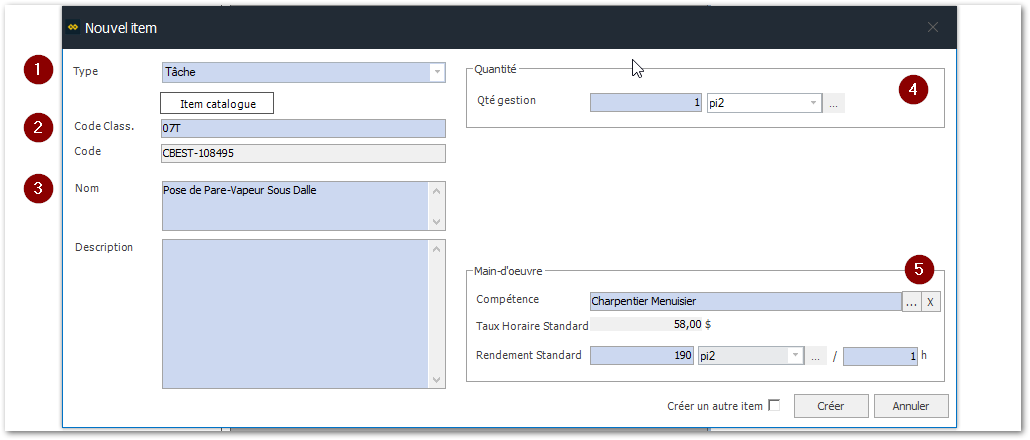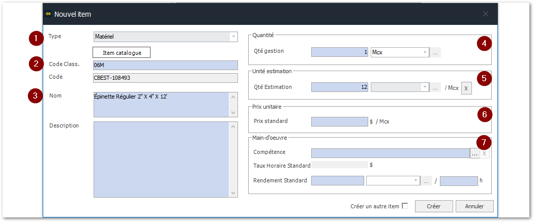 Finalement, si vous voulez compter votre main d’œuvre à chaque matériel, vous pouvez rentrer la compétence (le corps de métier) et la performance standard pour poser ce matériel. Nous ne recommandons pas cette pratique, pour ne pas avoir à entretenir vos rendements de main d’œuvre à plus d’une place pour une même tâche. Pour calculer votre main d’œuvre séparément, laissez cette section vide.