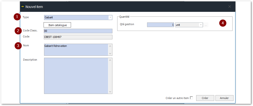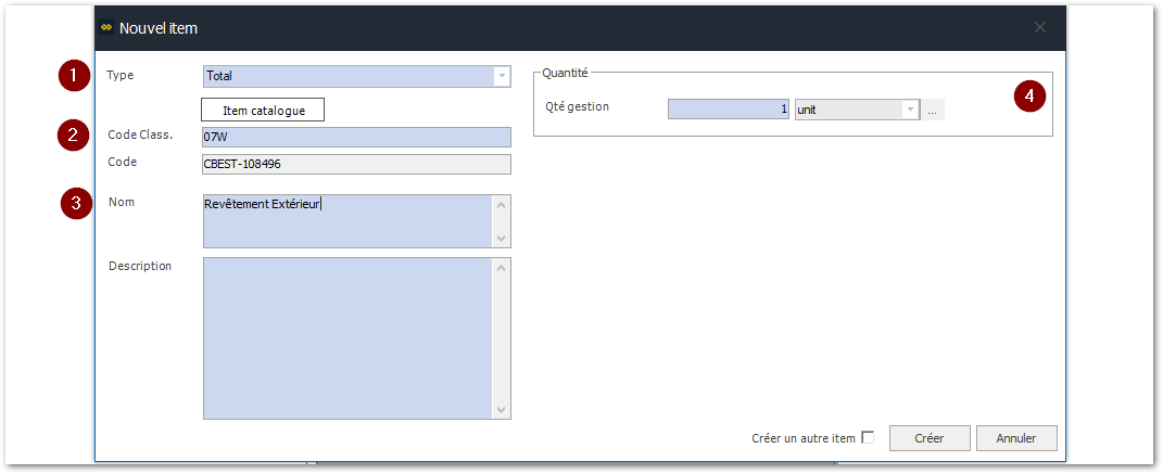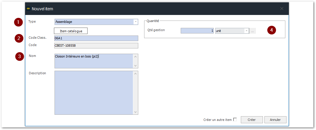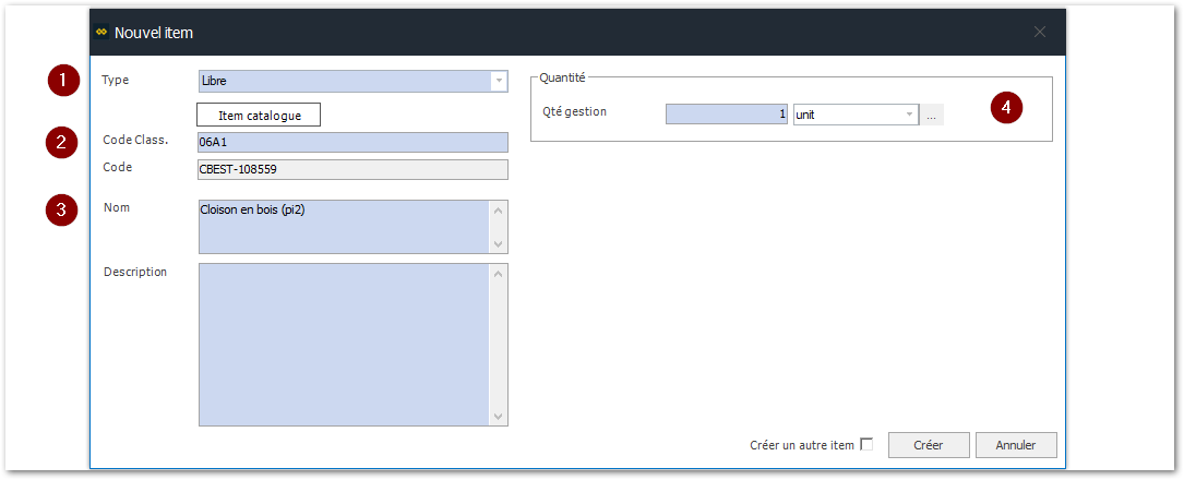 L’utilisation d’un item libre permet d’insérer ou supprimer des sous-items pour s’adapter aux plans et devis sans affecter l’assemblage original du catalogue.