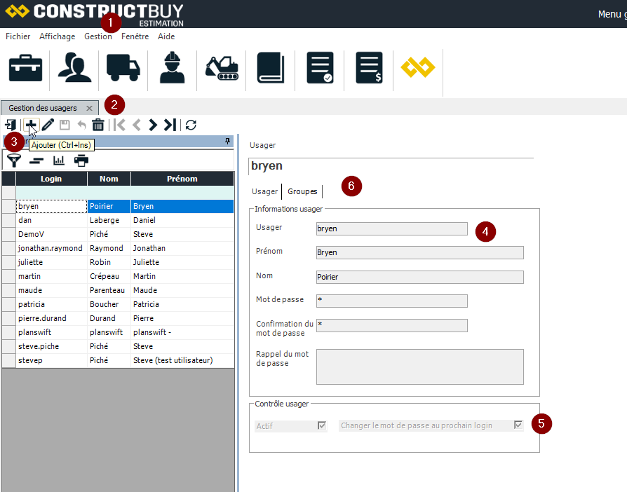 Chaque utilisateur d’ESTIMATION devrait avoir son propre usager. Cela permet de gérer les permissions de chacun individuellement. Chaque estimateur pourra aussi avoir son nom associé aux soumissions qu'il créé, et il sera plus facile de gérer les activités de chacun sur le logiciel. Le nombre d'usagers n'est pas limité sur ESTIMATION. Le nombre de connexions simultanées est limité par le nombre de licences.