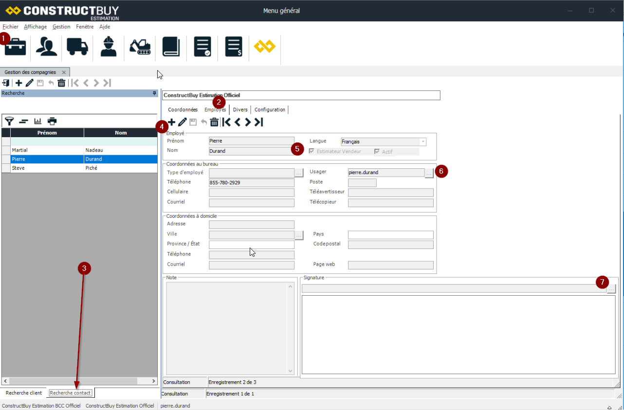 Il est possible de créer une ou plusieurs compagnies dans ESTIMATION, et d'associer les usagers à une ou plusieurs de ces compagnies en créant des employés. Seuls les employés d'une compagnie peuvent créer une soumission en leur nom (en tant qu'estimateur, vendeur ou autre), donc en associant votre usager à un employé de la compagnie, ESTIMATION associera automatiquement votre nom aux soumissions que vous créerez.