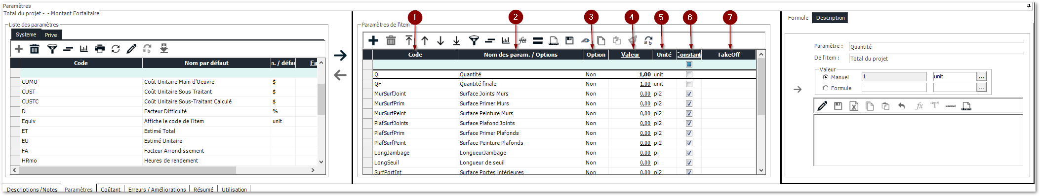 La colonne Valeur : Cette colonne contiendra les variables et formules requises pour la bonne estimation de l’item.