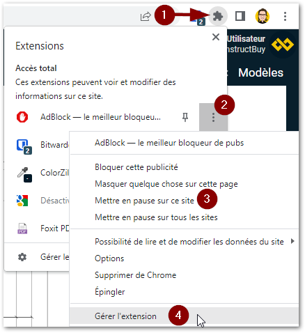 Certaines extensions peuvent causer d'énormes ralentissements dans l’utilisation de TAKEOFF, comme les bloqueurs de publicités tels que AdBlock et uBlock Origin