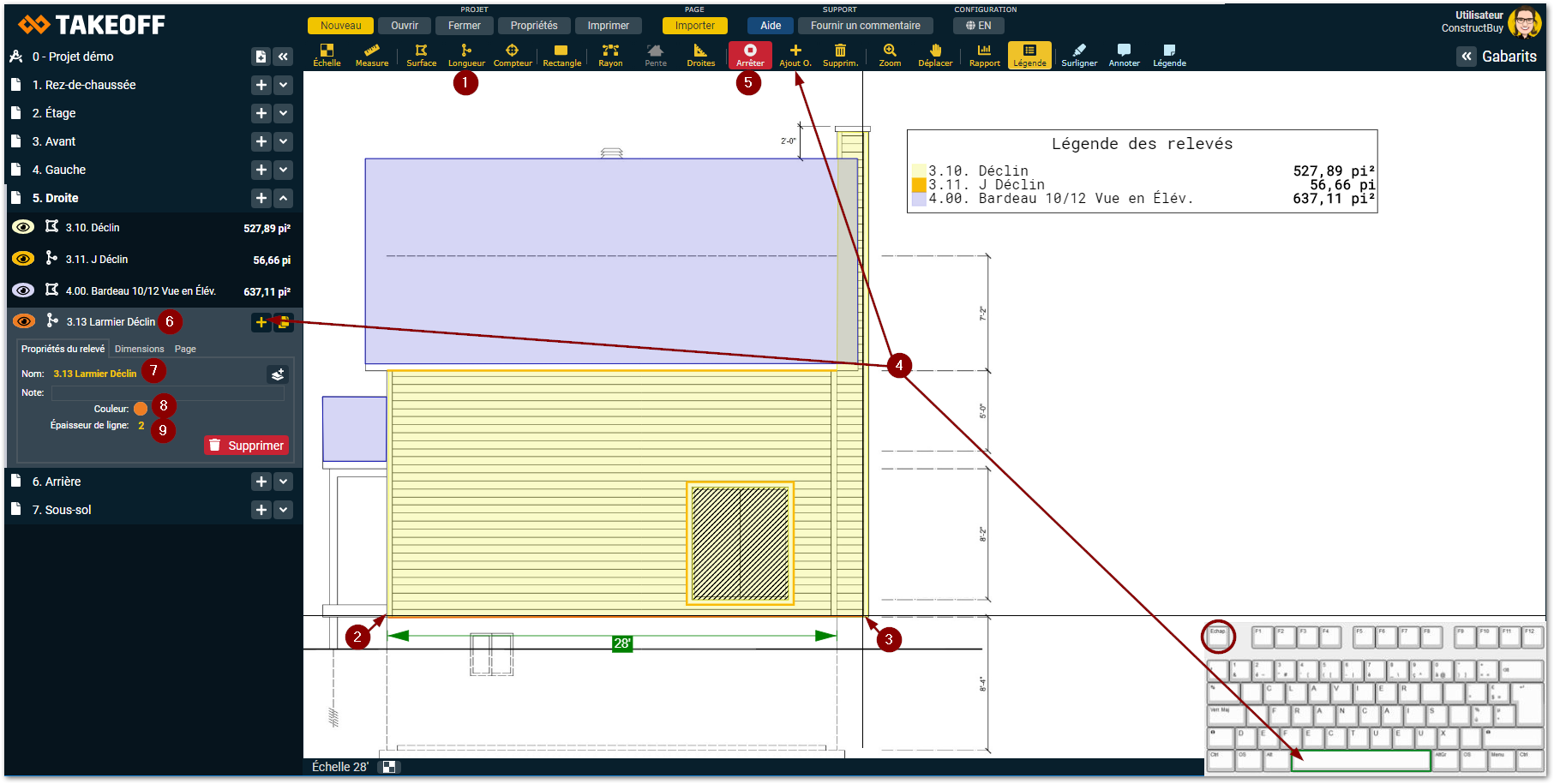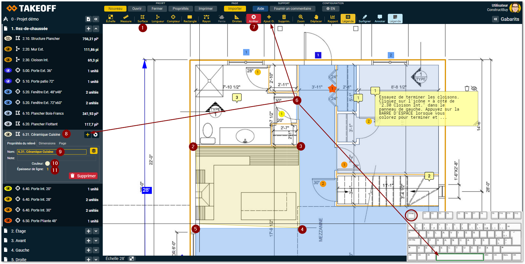 Si vous avez plusieurs objets à relever, utilisez la barre d’espace pour terminer une surface et en commencer une nouvelle du même type afin qu’elles s’aditionnent sous le même item de relevé (comme indiqué au point 6)