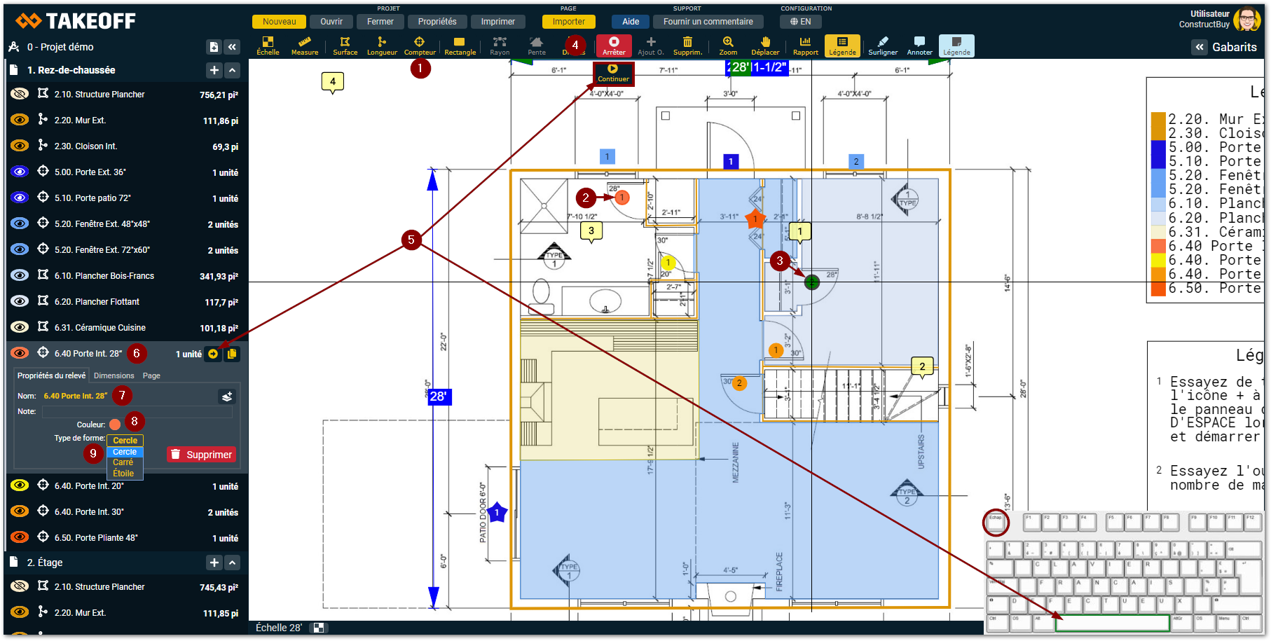 L'outil de compteur permet de calculer le nombre d'un même objet dans un plan, comme des fenêtres, des portes, des colonnes ou des prises de courant