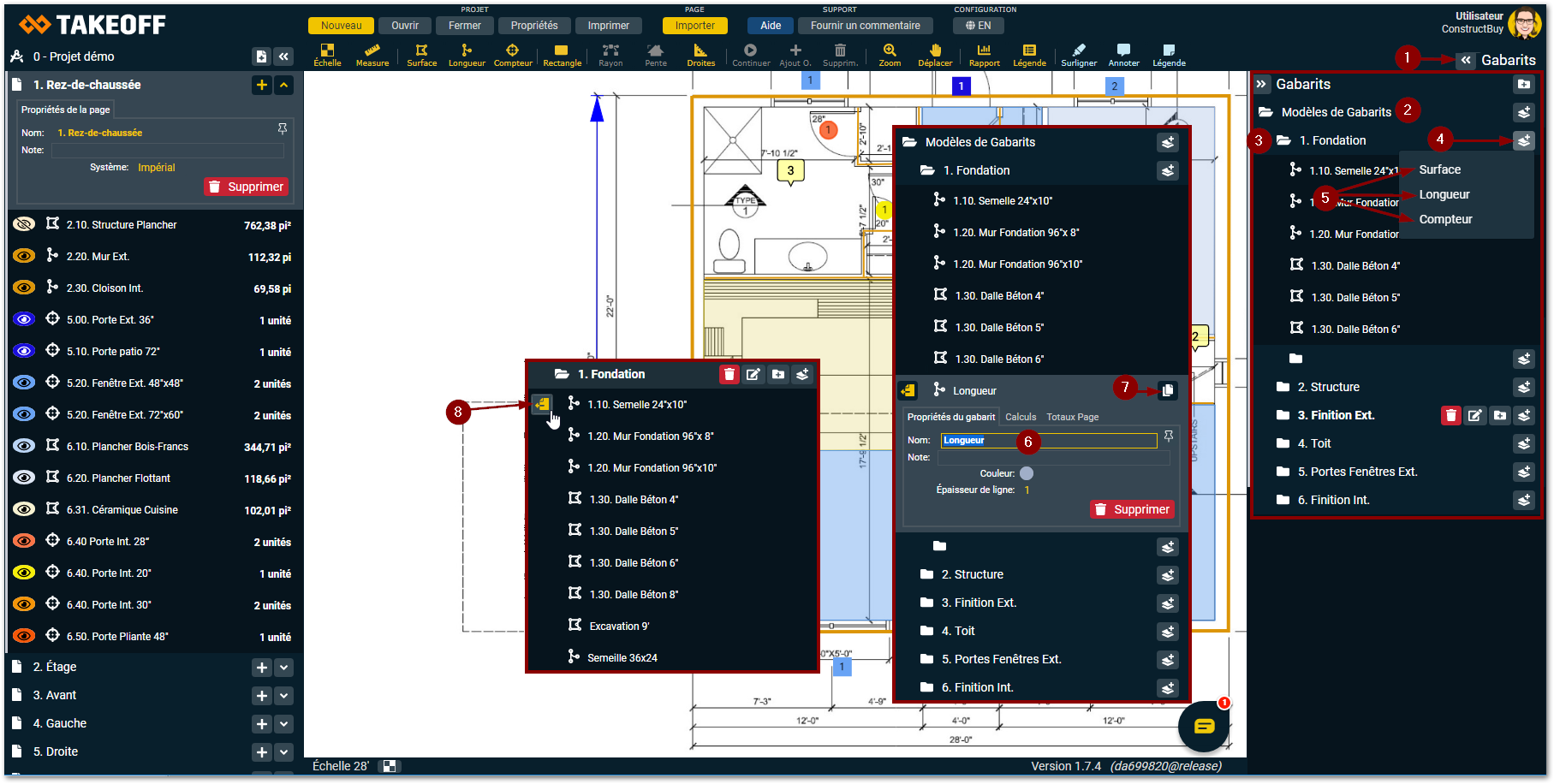 Le bouton qui apparaît à gauche lorsque vous passez votre souris sur un gabarit de relevé vous permet de créer un nouveau relevé des quantités à partir du gabarit sélectionné