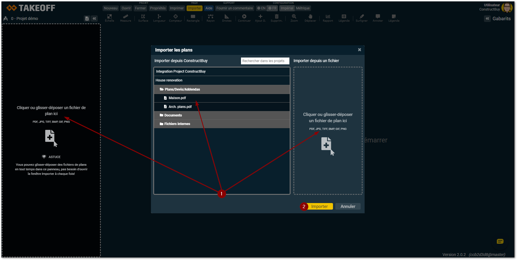 • Cliquez dans l'une des deux zones pointillées afin de parcourir les fichiers de votre ordinateurCliquez ensuite sur «Importer» pour ouvrir vos plans dans Takeoff