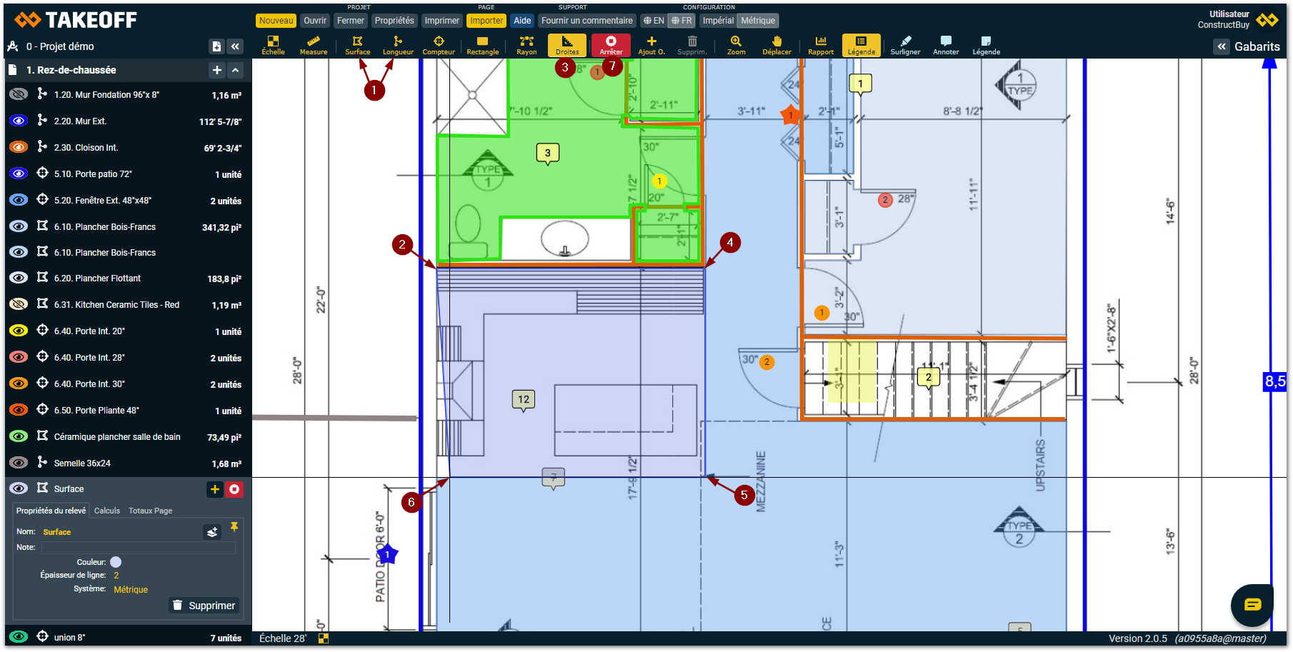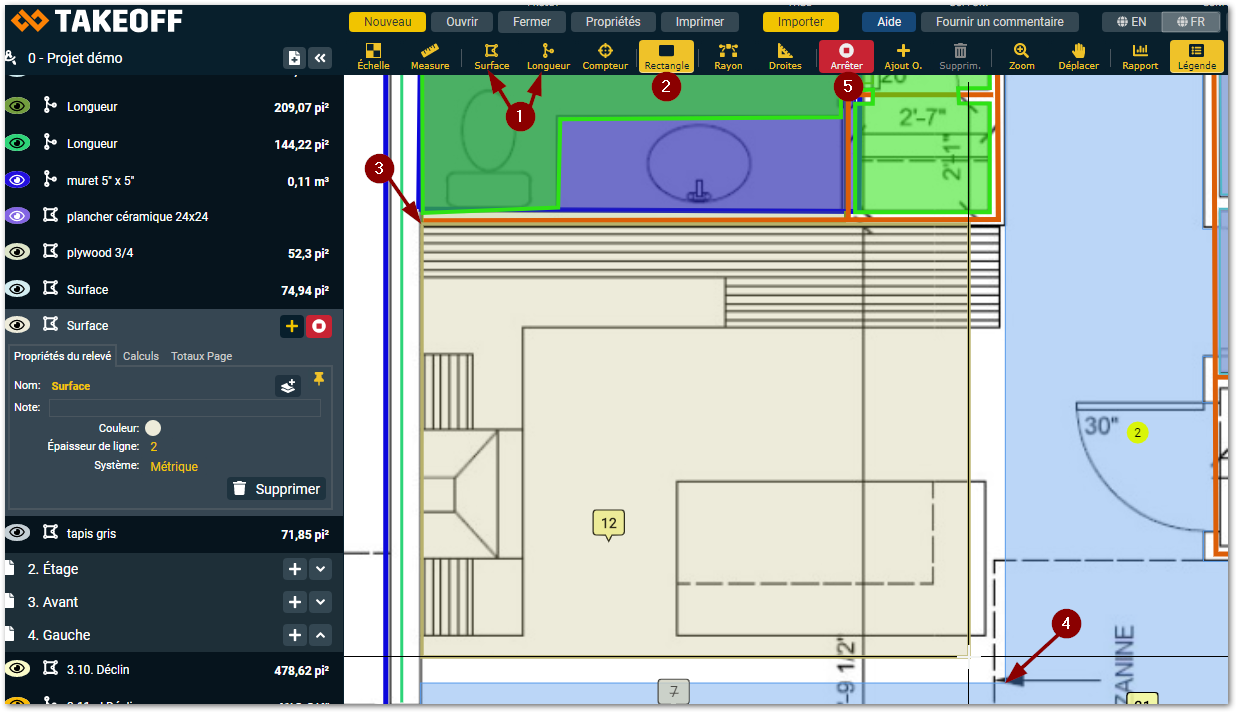 Cliquez sur l’outil surface ou l’outil longueur dans la barre d’outils en haut de la page