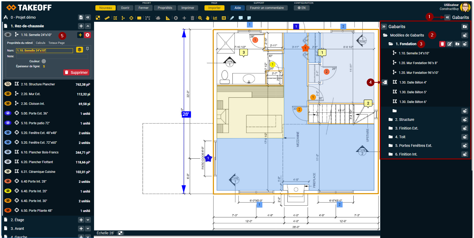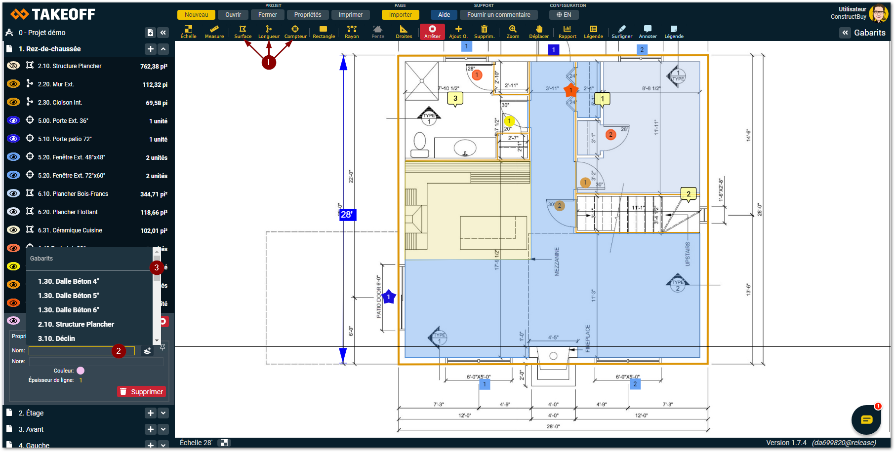 Créez un nouveau relevé des quantités du type désiré (surface, longueur ou compteur) en utilisant la barre d'outils située en haut de la page