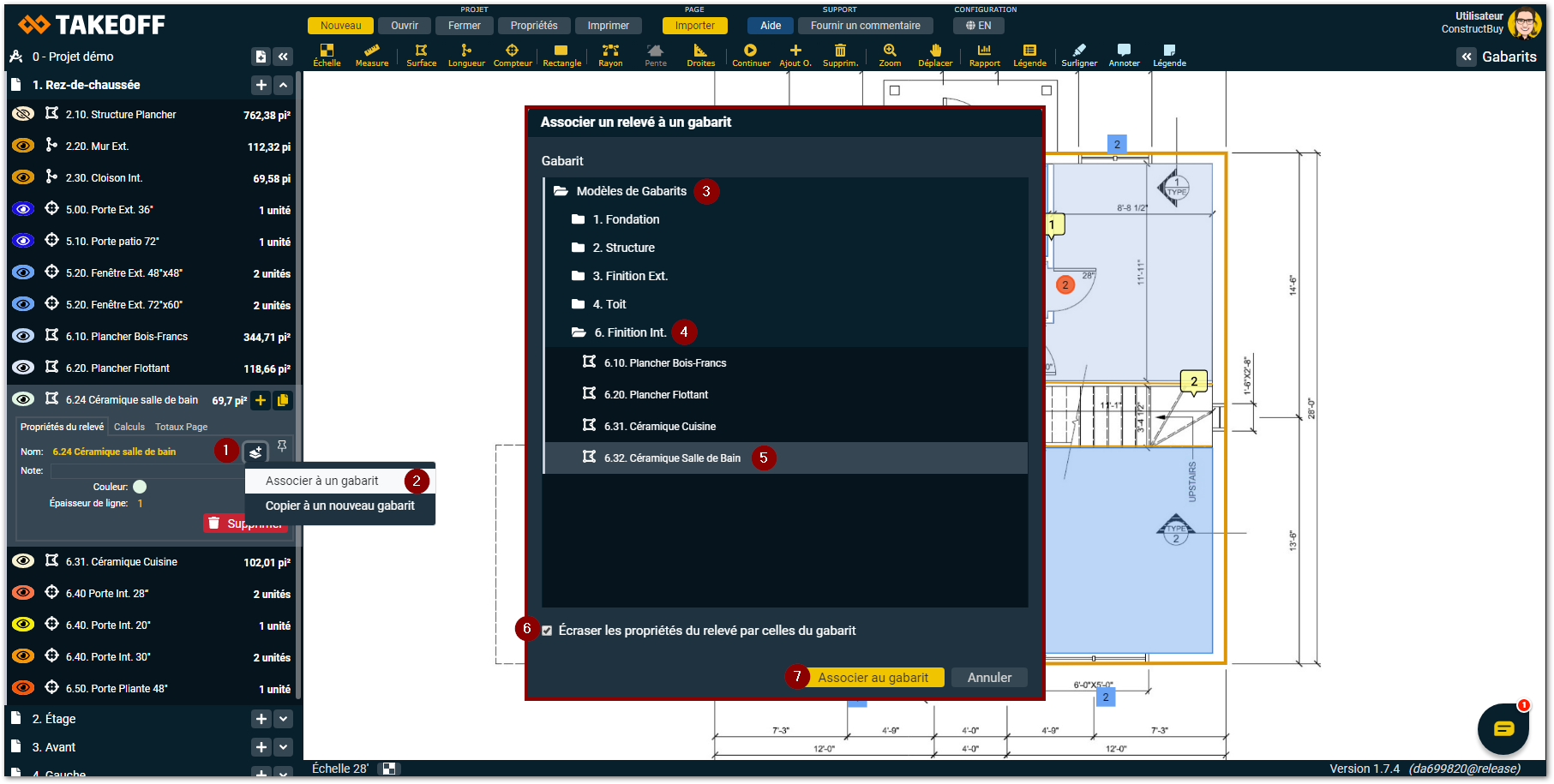 Cliquez sur le bouton jaune «Associer au gabarit» et votre relevé des quantités sera automatiquement associé au gabarit sélectionné